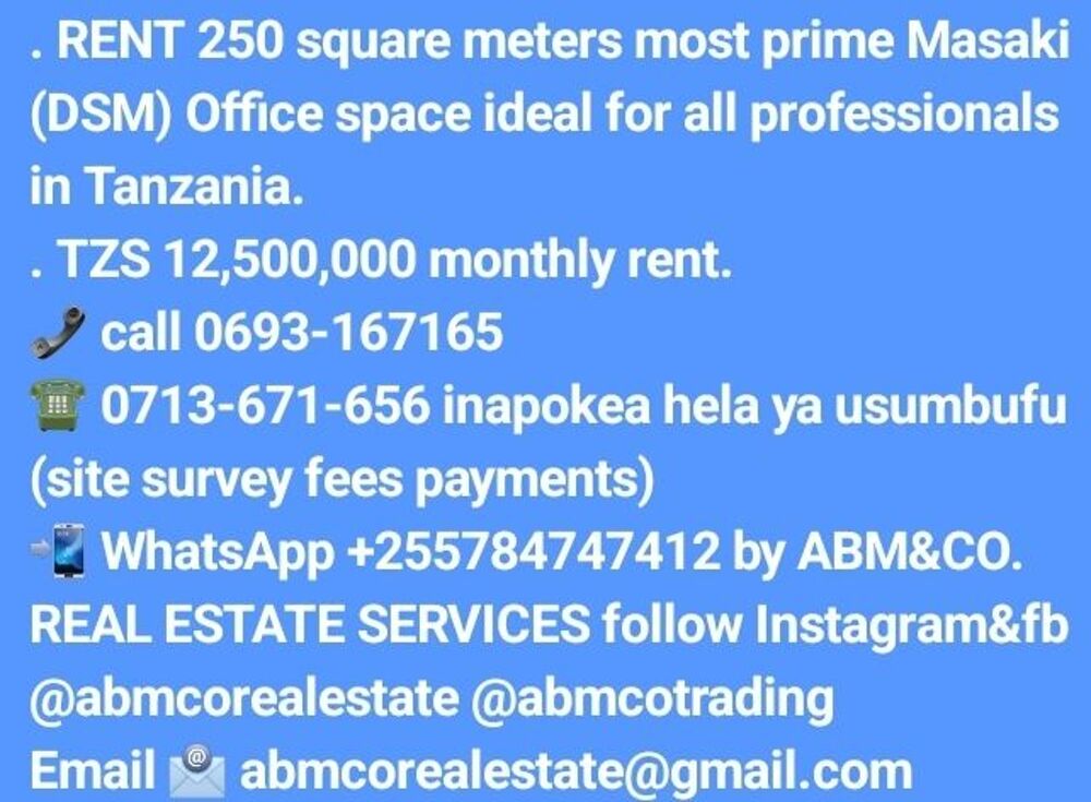 . RENT 250 square meters most prime Masaki (DSM) Office space ideal for all professionals in Tanzania. . TZS 12,500,000 monthly rent. 📞 call 0693-167165 ☎️ 0713-671-656 inapokea hela ya usumbufu (site survey fees payments) 📲 WhatsApp +255784747412 by ABM&CO. REAL ESTATE SERVICES follow Instagram&fb @abmcorealestate @abmcotrading Email 📧 abmcorealestate@gmail.com
